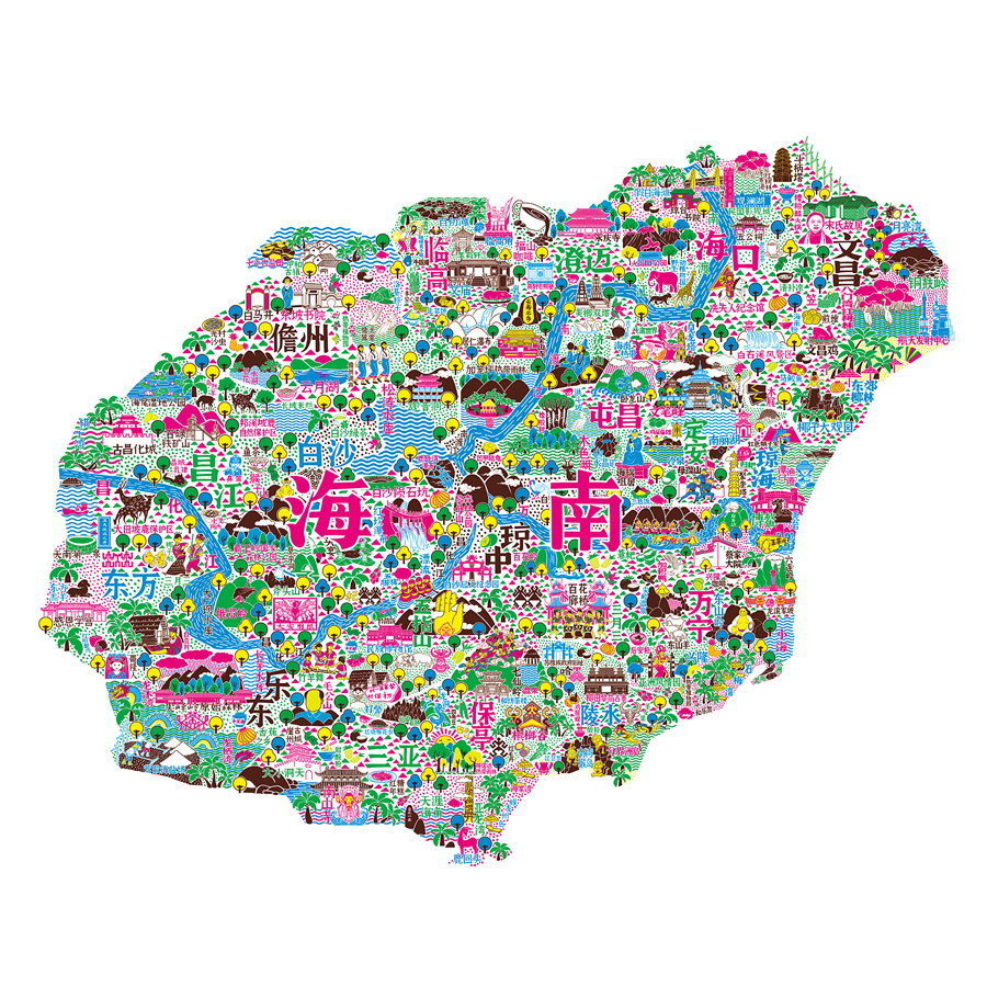 紅、藍(lán)、綠、黃、棕,五種絢麗鮮亮的色彩,形狀是海南島的輪廓,手繪地圖上,標(biāo)注著海南18個(gè)市縣地理位置,還匯集了各市縣的特色元素,凸顯海南的熱帶風(fēng)情。這幅作品正是由海南兩個(gè)80后小伙和他們的團(tuán)隊(duì)創(chuàng)作的“島留時(shí)光”系列。