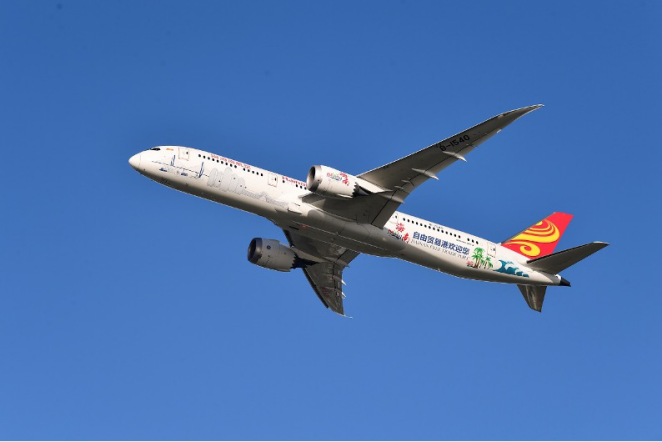 海南航空“海南自由貿(mào)易港號(hào)”主題涂裝波音B787飛機(jī)。(央廣網(wǎng)發(fā) 褚文銘 攝)