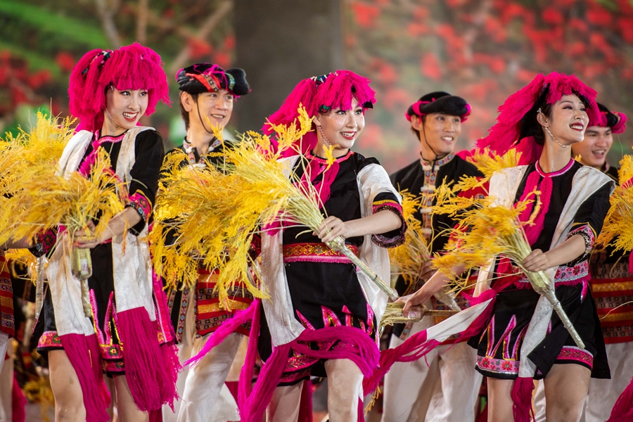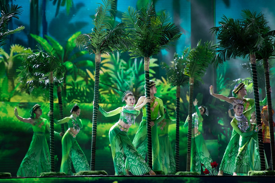 在文藝晚會(huì)上,以弘揚(yáng)和傳承海南黎族苗族優(yōu)秀傳統(tǒng)文化為主要內(nèi)容的歌舞表演,充分展現(xiàn)了海南黎族苗族人民歌頌愛(ài)情、祈福祝愿、贊美生活,共同努力奔向幸福之路的美好憧憬。