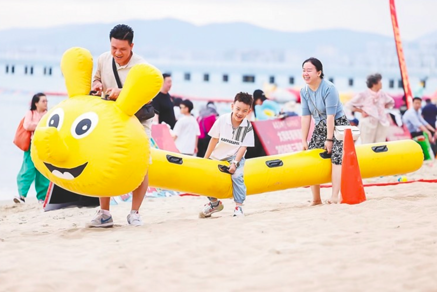 游客在三亞灣海灘體驗沙灘趣味活動項目。