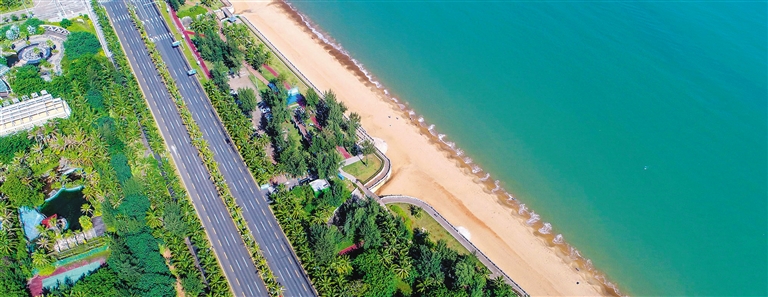10月10日,俯瞰?诿利惖奈骱0稁罟珗@,碧海銀灘、觀海長廊構(gòu)成一幅高顏值的椰城風(fēng)景線。