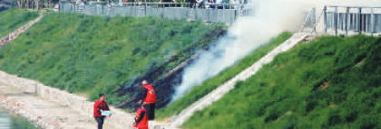 央廣網(wǎng)河南分網(wǎng)消息 據(jù)東方今報報道:濃煙刺鼻,幾名環(huán)衛(wèi)工用臉盆不停地舀河水滅火。附近晨練的市民介紹,這火是兩名在這里玩耍的頑童鬧的,孩子把坡堤上的綠化草皮點燃了。十幾分鐘后,火終于被澆滅,雖沒有造成更大的損失,但青青坡堤上焦黑一片。(記者 沈翔 攝影報道)