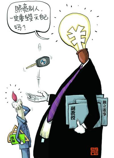 教授“富开宝马穷骑飞鸽”,何尝不是社会贫富差距的一个缩影,或者说影像投射?贫富问题,说到根本,就是一个资源配置的问题,怎样配置资源,这些资源就会怎样转化成教授手里多寡鲜明的票子。如果绝大多数资源是被权力、被权威高度垄断,大学的行政化倾向又将权威和权力迅速“整合”,另外一些资源又逾越教育底线地与资本媾和,那么相对应的,必然会从“权力”和“市场”两个层面,制造出一个个具体的、贫富不均的教授来。