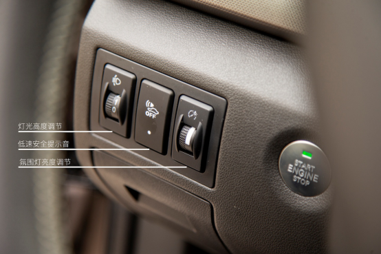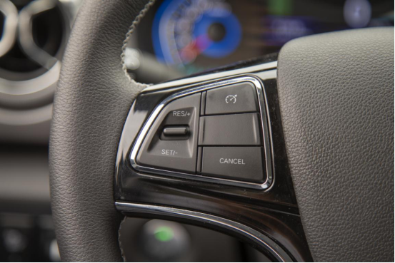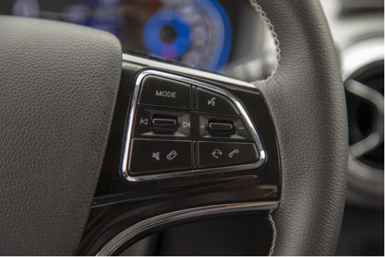 講到配置,EC5絕對(duì)不低。一鍵啟動(dòng)功能的按鍵設(shè)置在了方向盤的左下方,旁邊就是燈光高度調(diào)節(jié),氛圍燈亮度調(diào)節(jié)以及低速報(bào)警提示的開(kāi)關(guān)按鍵。
