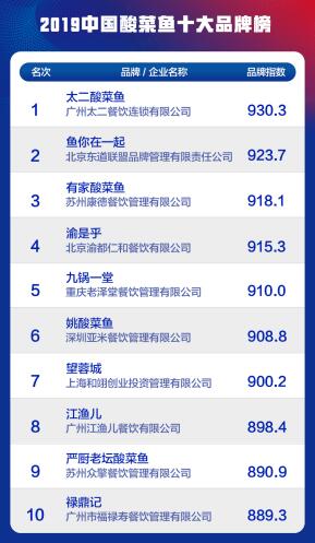 排名第一的是近兩年話題度最高的太二酸菜魚,酸菜魚快餐品牌魚你在一起、主打“能喝湯的酸菜魚”九鍋一堂緊隨其后。此外,“2019中國酸菜魚十大品牌”獲獎(jiǎng)品牌還包括渝是乎、有家酸菜魚、姚酸菜魚、望蓉城、江漁兒、嚴(yán)廚老壇酸菜魚、祿鼎記。