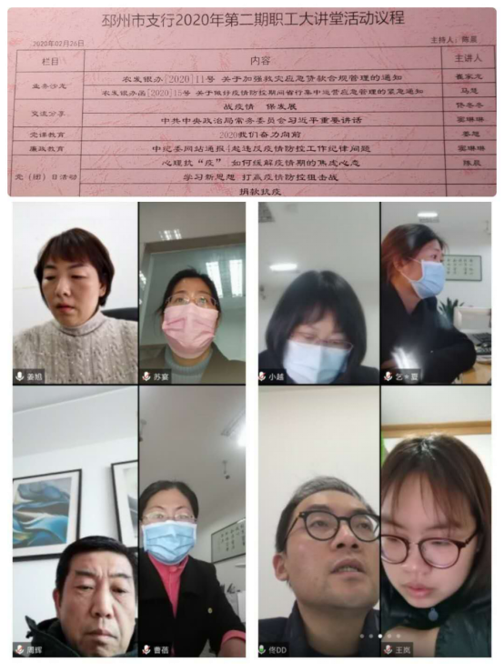 為貫徹落實(shí)上級行關(guān)于加強(qiáng)新型冠狀病毒感染的肺炎疫情防控工作系列要求,充分發(fā)揮黨支部在疫情防控中的基礎(chǔ)保障作用,調(diào)適疫情下返崗復(fù)工員工心理,2月28日,農(nóng)發(fā)行邳州支行利用云視頻會議系統(tǒng)開展“心理防疫”黨日活動,進(jìn)一步扎緊員工心理防疫“口罩。