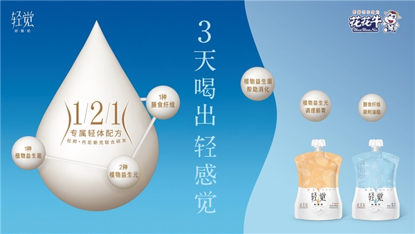 輕覺酸奶是河南花花牛集團旗下的一款功能性酸奶品牌。因其獨特的“121專屬輕體配方”而備受當下年輕人的歡迎!121”具體是指1種膳食纖維(抗性糊精)、2種植物益生元(低聚果糖、低聚木糖)、1種植物益生菌(植物乳桿菌)。這種組合的搭配不僅可以養(yǎng)護腸道,幫助消化維持腸道內菌群平衡,還能抑制糖類吸收、吸附油脂同事促進微量元素鐵,鈣的吸收,讓你重回輕松體態(tài)。121輕腸道,讓你輕松感覺的到。