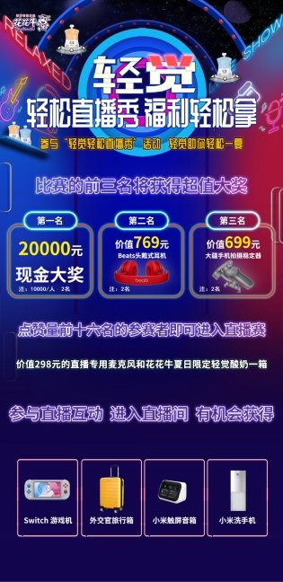一旦晉級進入直播賽環(huán)節(jié),重點來了!鄭州著名電視臺主持人將會鼎力助你直播!你看,成名已經邁出了一大步。除此之外,選手即可獲得價值298元的專業(yè)直播專用的麥克風和花花牛夏日限定輕覺酸奶一箱。而且直播間將直接搭建在花花牛鄭州牧場上,讓選手直接感受輕覺輕酸奶的原產地。比賽的前三名將會獲得豐厚的獎勵,第三名(注:2名)將會獲得大疆手機拍攝穩(wěn)定器,第二名(注:2名)將會獲得BEATS頭戴式耳機。第一名(注:10000元/每人,2名)不僅能夠獲得萬元獎金,還能直接成團出道,讓你自己直播當網紅。