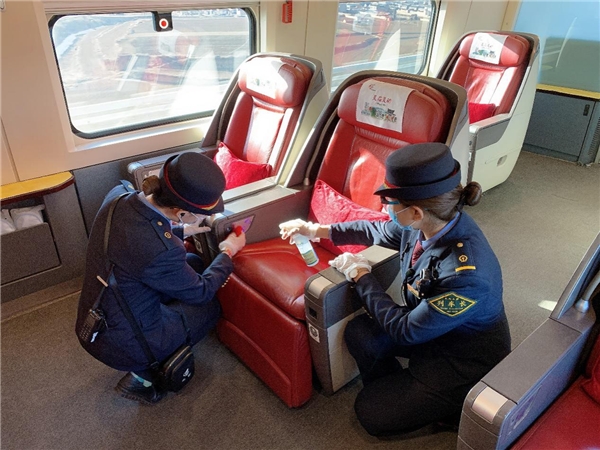 在出乘前,牛蕊和乘務員一起對關鍵地方再次進行消毒,做到不漏一角、不松一刻。