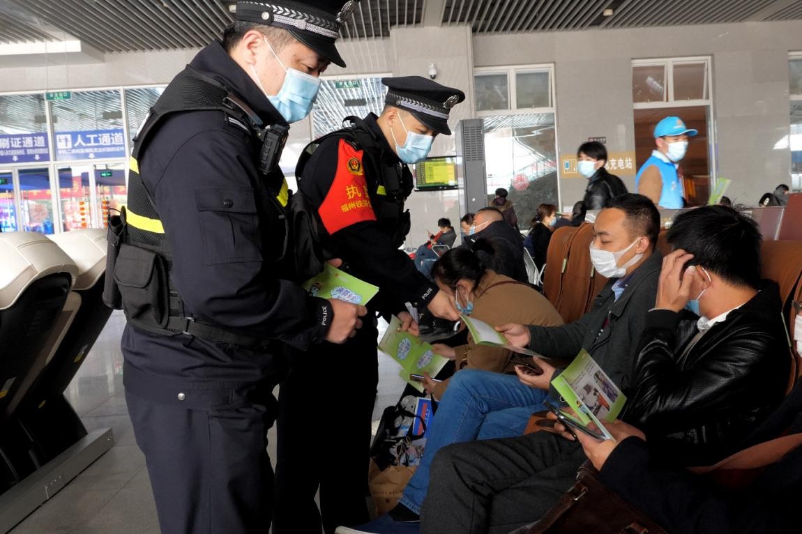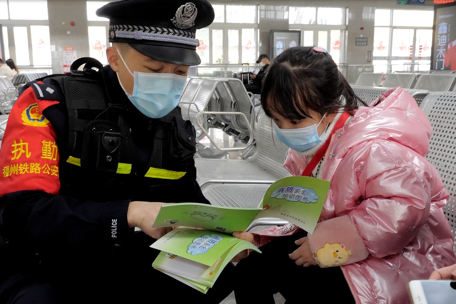 在動車站候車大廳,鐵路民警與消防志愿者為等候上車的旅客分發(fā)消防安全手冊,為他們講解消防器材的用途等消防常識,并通過消防控制室廣播臺向旅客播放消防安全常識。