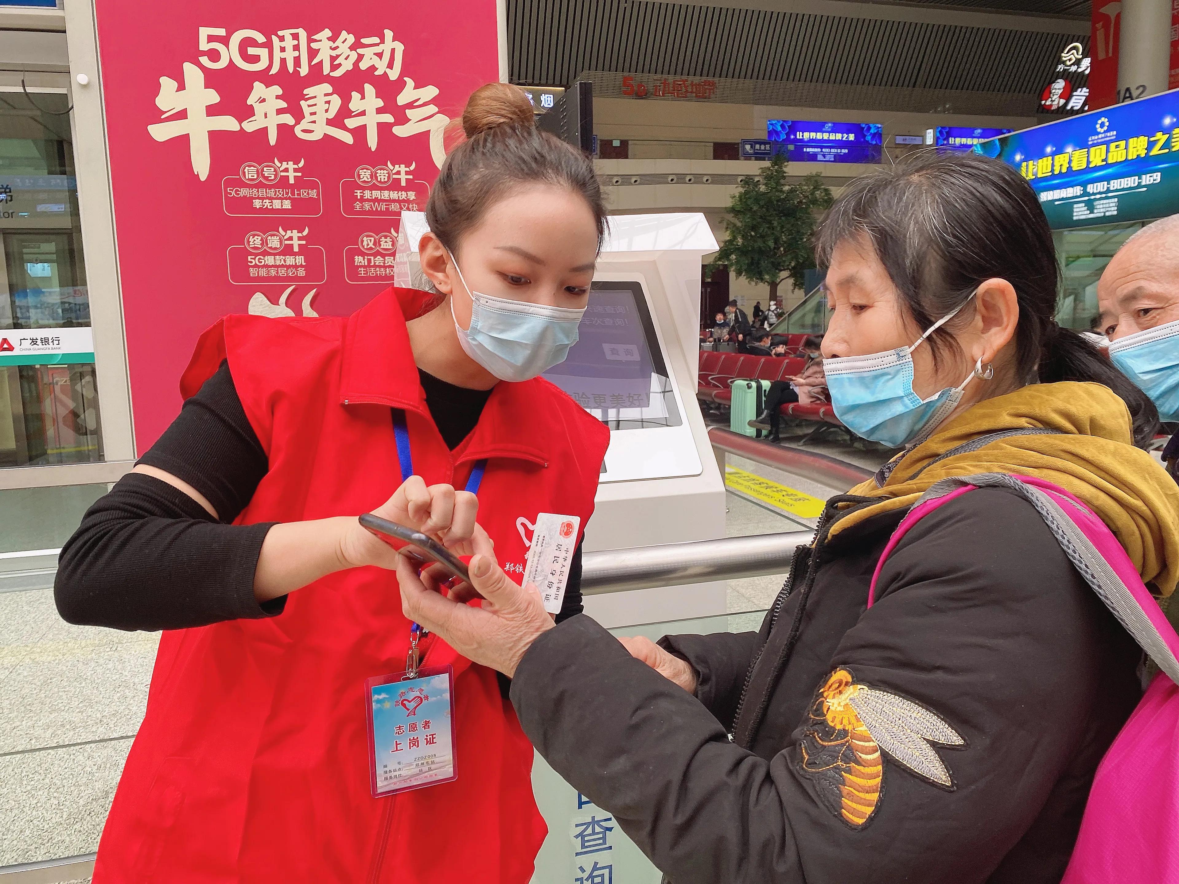 △鄭州鐵路局鄭州客運(yùn)段北京一隊(duì)青工志愿者宋藝潔(左一)在幫助旅客中