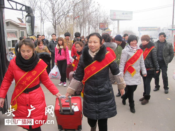 志愿者們幫農(nóng)民工拿行李、提包裹
