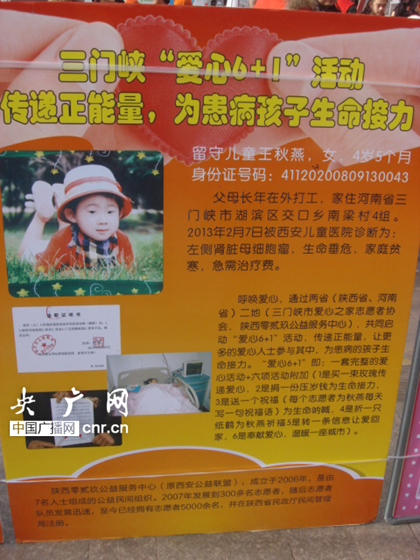 王秋燕:女,4歲5個(gè)月,家住三門峽市湖濱區(qū)交口鄉(xiāng)南梁村。2013年1月確診為腎母細(xì)胞瘤。2013年2月5號經(jīng)手術(shù)切除腎臟,現(xiàn)在正在西安兒童醫(yī)院治療。據(jù)主治醫(yī)生講,孩子還要進(jìn)行后期的化療放療,治療費(fèi)用預(yù)計(jì)需15萬元。