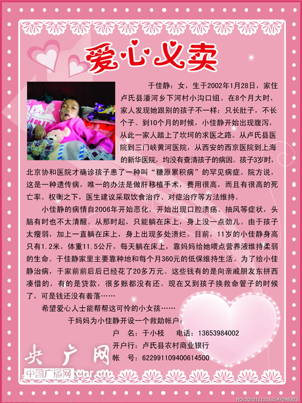 于佳靜:女,11歲,家住盧氏縣潘河鄉(xiāng)下河村小溝口組。在8個(gè)月大時(shí),家人發(fā)現(xiàn)她跟別的孩子不一樣:只長肚子,不長個(gè)子。到10個(gè)月的時(shí)候,小佳靜開始出現(xiàn)腹瀉,從此一家人踏上了坎坷的求醫(yī)之路。從盧氏縣醫(yī)院到三門峽黃河醫(yī)院,從西安的西京醫(yī)院到上海的新華醫(yī)院,均沒有查清孩子的病因。孩子3歲時(shí),北京協(xié)和醫(yī)院才確診孩子患了一種叫“糖原累積病”的罕見病癥。院方說,這是一種遺傳病,唯一的辦法是做肝移植手術(shù),費(fèi)用很高,而且有很高的死亡率。權(quán)衡之下,醫(yī)生建議采取飲食治療、對癥治療等方法維持。