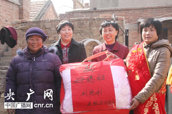 央廣網(wǎng)河南分網(wǎng)消息 在三八婦女節(jié)到來(lái)之際,3月3日,濮陽(yáng)市婦聯(lián)在華龍區(qū)皮拐村舉辦了別開(kāi)生面的“夸媳婦 賀娘家”活動(dòng)。在活動(dòng)現(xiàn)場(chǎng),敲鑼打鼓放鞭炮,好媳婦們披紅戴花,在村民的簇?fù)硐禄氐侥锛,婦聯(lián)的同志和村干部將太空被等獎(jiǎng)品送到好媳婦的娘家人手中,表彰他們培養(yǎng)出好媳婦的功勞。今天評(píng)選出的6名好媳婦,既有尊老敬老的典型,也有帶頭致富的典型。陳榮甫就是其中的一位,幾年前婆婆去世后她承擔(dān)起照顧奶奶的責(zé)任,在她的照料下,87歲的奶奶身體硬朗,精神矍鑠。提起自己的孫媳婦,老人家贊不絕口。