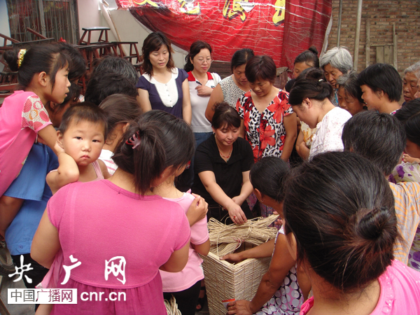 河南省商丘市婦聯(lián)駐村工作隊請專人教村里的婦女學(xué)習(xí)手編技術(shù)