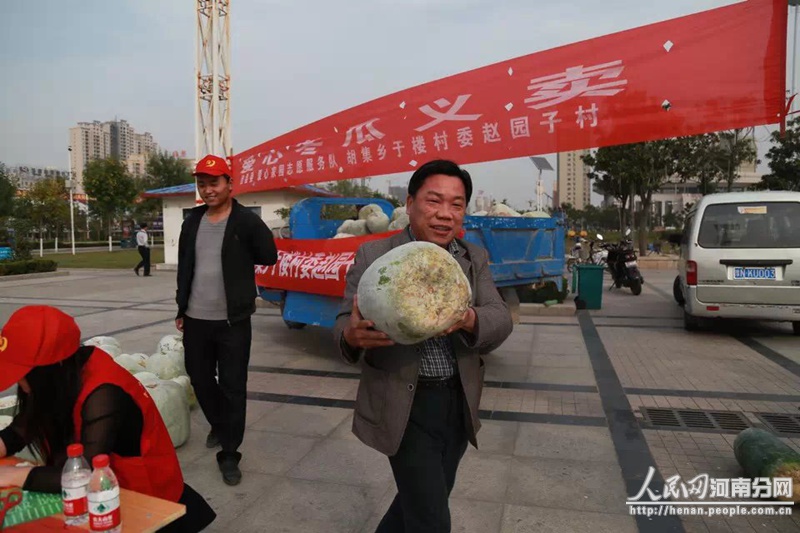 志愿者們幫助該縣胡集鄉(xiāng)趙園子村一農民義賣冬瓜。王磊提供