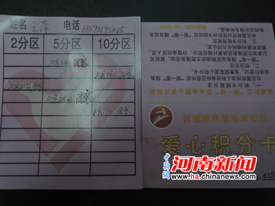 據(jù)了解,從今年6月份開始,由社區(qū)所屬單位河南省煤田地質(zhì)局四隊出資購買部分生活用品作為愛心兌換的物資。社區(qū)居民可以通過獻血、義務為老人理發(fā)、清除社區(qū)墻體小廣告、大掃除、輔導孩子做功課等多種形式獻愛心、參與社區(qū)志愿服務。每次活動后都會有社區(qū)負責人在專門設計的“愛心積分卡”上為參與志愿服務的居民進行積分簽字確認,居民按照服務、奉獻類型可獲得2分、5分、10分三個檔次的積分。