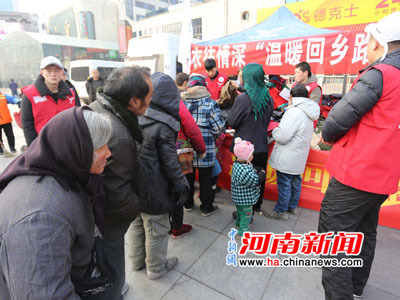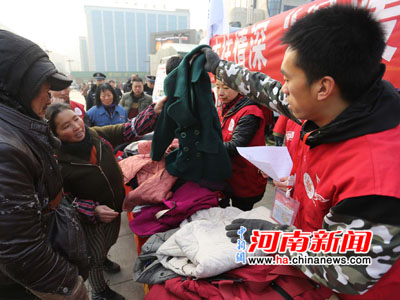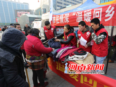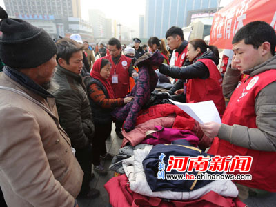 央廣網(wǎng)河南分網(wǎng)消息 2月4日,外來(lái)務(wù)工人員在鄭州火車站廣場(chǎng)領(lǐng)取愛心棉衣。當(dāng)日,“衣往情深溫暖回鄉(xiāng)路”志愿者公益活動(dòng)在鄭州火車站廣場(chǎng)舉行,由鄭州多家愛心單位聯(lián)合組織募捐的一千多件經(jīng)過(guò)消毒清洗后的愛心棉衣發(fā)放給回鄉(xiāng)的外來(lái)務(wù)工人員,溫暖他們的回鄉(xiāng)路。(楊正華)