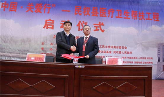 央廣網(wǎng)河南分網(wǎng)1月22日消息 2016年12月16日,中國(guó)農(nóng)工民主黨中央與中共河南省委、省人民政府簽署了相關(guān)戰(zhàn)略合作框架協(xié)議,農(nóng)工民主黨中央把河南省作為推進(jìn)健康中國(guó)、美麗中國(guó)的重要實(shí)踐基地。由農(nóng)工民主黨中央主辦的中國(guó)初級(jí)衛(wèi)生保健基金會(huì)聯(lián)合農(nóng)工民主黨河南省委主辦、中國(guó)初級(jí)衛(wèi)生保健基金會(huì)“東方關(guān)愛公益基金”與中共民權(quán)縣人民政府共同承辦的“健康中國(guó)?關(guān)愛行”—民權(quán)縣醫(yī)療衛(wèi)生幫扶工程啟動(dòng)儀式于2017年1月20日在民權(quán)縣舉行。中國(guó)初級(jí)衛(wèi)生保健基金會(huì)秘書長(zhǎng)周慶年,中國(guó)農(nóng)工民主黨河南省委會(huì)專職副主委花亞偉,中共商丘市委統(tǒng)戰(zhàn)部部長(zhǎng)岳文華,國(guó)家質(zhì)檢總局動(dòng)植司綜合處處長(zhǎng)吳昊,河南省出入境檢驗(yàn)檢疫局動(dòng)植處副處長(zhǎng)宗靖,中共商丘市衛(wèi)計(jì)委主任張樹仁,中國(guó)初級(jí)衛(wèi)生保健基金會(huì)“東方關(guān)愛公益基金”管委會(huì)主任王鋒、籌資聯(lián)絡(luò)部部長(zhǎng)李冠軍、公益事業(yè)部部長(zhǎng)王云鵬,中共民權(quán)縣縣委副書記、縣長(zhǎng)張團(tuán)結(jié),中共民權(quán)縣委常委、統(tǒng)戰(zhàn)部長(zhǎng)、副縣長(zhǎng)卞文燦,中共民權(quán)縣委常委、副縣長(zhǎng)駱軍,中共民權(quán)縣正縣級(jí)縣領(lǐng)導(dǎo)朱華光、民權(quán)縣衛(wèi)計(jì)委主任朱繼兵等領(lǐng)導(dǎo)及嘉賓出席儀式并致辭。
