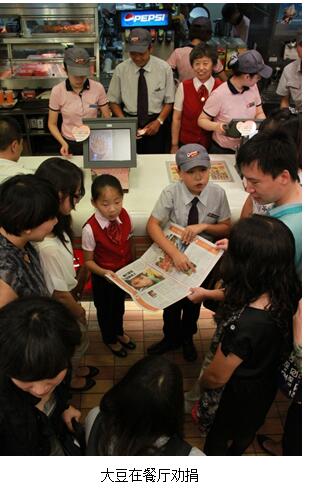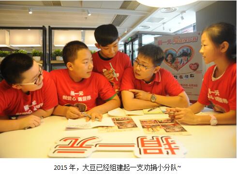 他記住了每年暑假,都要為云南的貧困孩子籌集營養(yǎng)餐的善款。每到“捐一元”啟動的時候,“大豆”都會瞬間開啟勸捐模式,帶著身邊的同學去肯德基餐廳為山區(qū)的小朋友捐一元錢,或者直接帶著大家到餐廳幫忙勸捐,這一習慣從小學到初中,至今已經堅持了八年,這對一個孩子來說,并不是一件簡單的事情,而今他身邊幾乎所有的朋友都成為了捐一元的“小粉絲”,當年的一顆種子,已經長成了一片森林。