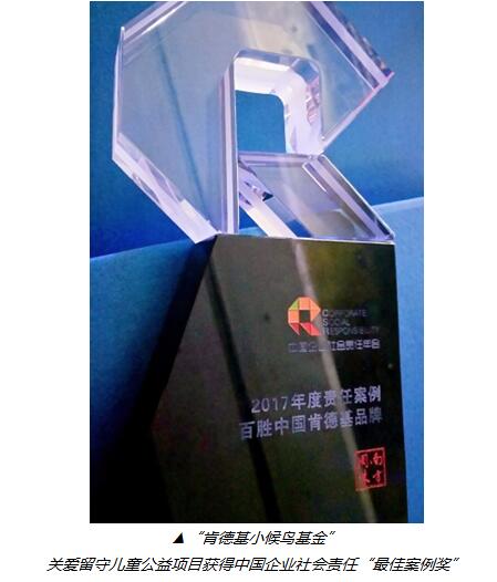 7月28日,第九屆中國(guó)企業(yè)社會(huì)責(zé)任年會(huì)(以下簡(jiǎn)稱(chēng)“責(zé)任年會(huì)“)在北京召開(kāi),“肯德基小候鳥(niǎo)基金”公益項(xiàng)目榮獲責(zé)任年會(huì)頒發(fā)的“年度責(zé)任案例”獎(jiǎng)。這是繼去年肯德基“天使餐廳”公益項(xiàng)目在責(zé)任年會(huì)上獲獎(jiǎng)之后,肯德基的企業(yè)社會(huì)責(zé)任實(shí)踐再次獲得認(rèn)可。