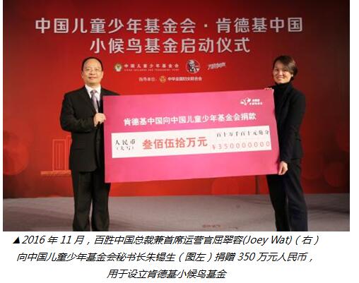 肯德基進(jìn)入中國(guó)30年來(lái),植根本土,不斷創(chuàng)新,為消費(fèi)者提供更多美食和自在的體驗(yàn)。與此同時(shí),肯德基不忘回饋社會(huì),發(fā)揮行業(yè)優(yōu)勢(shì),積極為有需要的人群提供溫暖的關(guān)愛(ài)。除“肯德基小候鳥(niǎo)基金”外,更通過(guò)肯德基“天使餐廳“、百勝中國(guó)”捐一元“、“肯德基曙光基金”等旗艦公益項(xiàng)目,幫助兒童健康快樂(lè)地成長(zhǎng),讓身處弱勢(shì)的青年獲得更多發(fā)展的機(jī)會(huì),同時(shí)為社區(qū)發(fā)展貢獻(xiàn)自己的力量,讓更多人享受生活,盡情自在。