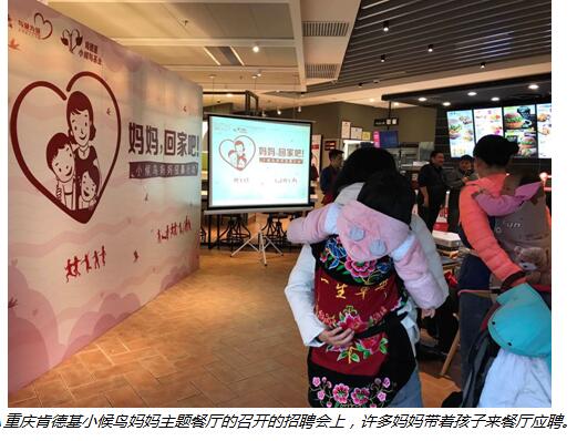 湖南和重慶的肯德基更與當(dāng)?shù)叵嚓P(guān)機(jī)構(gòu)合作,在湖南發(fā)起“小候鳥(niǎo)媽媽”回家行動(dòng),在重慶打造“小候鳥(niǎo)媽媽主題餐廳”,為長(zhǎng)期在外務(wù)工、孩子獨(dú)自留守老家的“小候鳥(niǎo)媽媽”優(yōu)先提供就近的肯德基餐廳就業(yè)崗位,幫助她們回到孩子身邊就業(yè),讓媽媽有更多時(shí)間、更用心地陪伴自己的孩子。