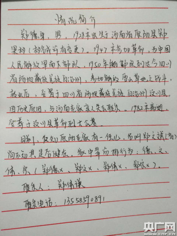 鄭警官告訴冷中玉,他叫鄭謙按輩分應(yīng)叫鄭體謙,是四川省茂縣公安局一名警察,現(xiàn)在阿壩州公安局工作。他的爺爺叫鄭德身,1947年時(shí),19歲的爺爺在老家河南原陽縣鄭皋村參加革命,1950年隨部隊(duì)達(dá)到四川阿壩藏族羌族自治州參加解放雪山草地戰(zhàn)爭,轉(zhuǎn)業(yè)后安置在四川阿壩藏族羌族自治州汶川縣,因?yàn)闅v史原因,從1966年開始就與老家人失去了聯(lián)系,1982年因病去世,葬在汶川縣烈士公墓。目前,他僅知道原陽老家還有爺爺?shù)囊粋(gè)侄子叫鄭文斌。期間也遇到幾次開著豫G牌照車的新鄉(xiāng)人,請他們幫忙但是都沒能與老家親人聯(lián)系上,希望冷中玉能夠幫助自己了卻爺爺多年的遺愿。