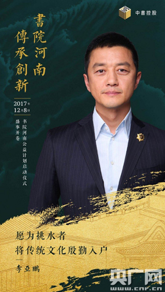河南籍影視演員、中書控股集團(tuán)董事長(zhǎng)李亞鵬是書院中國(guó)文化發(fā)展基金會(huì)及“書院河南公益計(jì)劃”的發(fā)起人。當(dāng)日,該集團(tuán)進(jìn)駐鄭州國(guó)際文化創(chuàng)意產(chǎn)業(yè)園的鄭州·中國(guó)文谷項(xiàng)目同時(shí)啟動(dòng)。項(xiàng)目中的“中國(guó)書院小鎮(zhèn)”板塊將和“書院河南公益計(jì)劃”相互配合開展多樣活動(dòng),為傳統(tǒng)書院文化注入新活力,賦予其當(dāng)代功能與使命。李亞鵬表示,多年來他致力于書院中國(guó)文化公益活動(dòng),希望為優(yōu)秀傳統(tǒng)文化尋找落腳地,希望為老家河南從文化大省建設(shè)成文化強(qiáng)省盡一己之力。