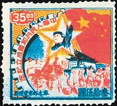 《中華人民共和國成立紀念》郵票,全套一枚,票幅規(guī)格為30×27毫米。郵票圖案以北京前門為背景,左側(cè)半圓形立體齒輪上鮮明印有“1949中華人民共和國成立紀念” 紅色隸書票名,右側(cè)是一面迎風飄揚的五星紅旗和一顆光芒四射的黃色五角星,五角星內(nèi)繪有毛主席揮動左臂的形象,國旗下勾畫岀長城、工廠、機器和群眾游行隊伍。左上角印有阿拉伯數(shù)字“35”(關(guān)東幣),左下角、右下角分別印有“旅大郵電管理局” “叁拾伍圓” (面值)藍色楷書字樣。該郵票由曹鴻毅設(shè)計畫稿,秦少浦繪制版圖,采用紅、藍、黃三色膠版套印,《旅大人民日報》社(今《大連日報》)印刷廠印制。