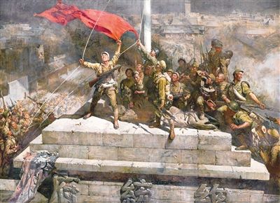 1949年,百萬雄師強(qiáng)渡長江占領(lǐng)了國民黨中央政府所在地南京,把勝利的紅旗插上了蔣介石“總統(tǒng)府”的門樓上。陳逸飛、魏景山的油畫《攻占總統(tǒng)府》著力塑造了一組不同年齡、經(jīng)歷和性格的普通戰(zhàn)士群像,宛如一座士兵的豐碑,處在中心的是一位身經(jīng)百戰(zhàn)、老練精悍的戰(zhàn)士,他扯下了千瘡百孔的國民黨黨旗,正揮臂展開紅旗準(zhǔn)備將紅旗升上高空。