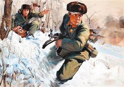 邱少云于1951年3月參加中國人民志愿軍赴朝作戰(zhàn),1952年10月12日因美軍燃燒彈落在邱少云潛伏點(diǎn)附近,火勢蔓延至其身上,為避免目標(biāo)暴露,他放棄自救壯烈犧牲,時年26歲。1953年8月30日,邱少云被追認(rèn)為中國共產(chǎn)黨黨員。油畫《邱少云》中,就塑造了這樣一個可歌可泣的英雄形象。油畫《羅盛教》,講述了1952年1月2日,志愿軍47軍第141偵察隊文書羅盛教在朝鮮平安南道冒著零下20攝氏度的嚴(yán)寒,三次跳入冰窟中搶救落水朝鮮兒童崔瑩而不幸犧牲的事跡。珍寶島自衛(wèi)反擊戰(zhàn),是中國人民解放軍邊防部隊在珍寶島擊退前蘇聯(lián)軍隊入侵的戰(zhàn)斗。1969年3月,前蘇聯(lián)軍隊幾次對黑龍江省烏蘇里江主航道中心線中國一側(cè)的珍寶島實施武裝入侵,并向中國岸上縱深地區(qū)炮擊,中國邊防部隊被迫進(jìn)行自衛(wèi)反擊。何孔德的《生命不息 沖鋒不止》就記錄這樣的沖鋒時刻。