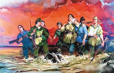 1938年10月,以冷云為首的東北抗日聯(lián)軍8名女官兵,主動吸引日偽軍火力,使我軍主力迅速擺脫敵人的攻擊。女戰(zhàn)士們被敵軍圍困河邊,在戰(zhàn)至彈盡的情況下,她們毀掉槍支,挽臂涉入烏斯渾河集體沉江。在全山石創(chuàng)作的油畫《中華兒女——八女投江》這幅畫中,八位抗聯(lián)女戰(zhàn)士互相扶持,艱難行走在滾滾江水中,激戰(zhàn)后的她們傷痕累累、衣衫襤褸,但她們臉上流露出的寧死不屈的頑強(qiáng)和英勇就義的從容讓人無比動容。