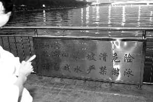 昨晚,記者在運(yùn)河?xùn)|碼頭采訪時發(fā)現(xiàn),出事運(yùn)河附近設(shè)有“水深4米、坡滑危險、請勿戲水,嚴(yán)禁游泳”的警示牌。