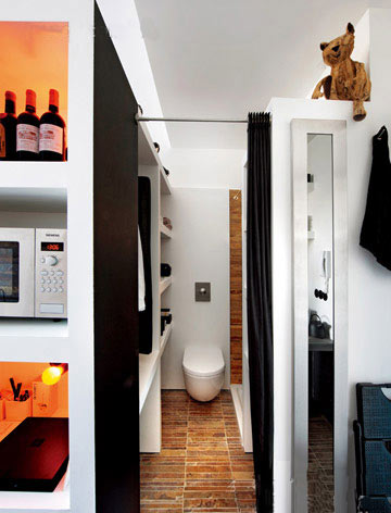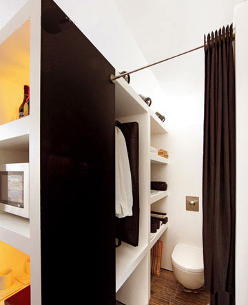 Anton是建筑攝影師,與設計類雜志的合作也十分密切。憑借這些年在創(chuàng)作中的感悟,他開始對室內(nèi)設計產(chǎn)生了興趣,并以圈內(nèi)人士自居。于是,當看到這所建于上世紀70年代的學生公寓時,他的創(chuàng)作激情被激發(fā)了。這是歐洲典型的大學生公寓格局,進門處是敞開式廚房和衛(wèi)生間,往里走是一個方形的空間,簡單、刻板、毫無生氣。長寬為5米×3米,同樣是個尷尬的尺寸。不少朋友勸他放棄這個“雞肋”的住所,因為面積實在太小。如果一味地追求擴大空間使用率,很可能造成視覺上過于結構化,沒有情感。一向喜歡在創(chuàng)作中注入個人表達的安東顯然不會這么做,他大膽打破原有格局,巧妙利用一收一放的對比,在15平米空間內(nèi),安排了一切正常居住所需要的功能區(qū)域。而且,獨特的選材和配色,讓小空間充滿原創(chuàng)的新奇感以及現(xiàn)代的大都市風情。