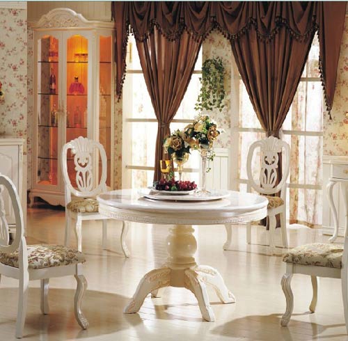 桌面中央人性化地設(shè)置了一個(gè)轉(zhuǎn)盤,用餐時(shí)十分方便。厚重的桌腳,鏤空花紋的椅子,都傳遞著一個(gè)信息:時(shí)尚而不失傳統(tǒng),高貴而不失典雅。