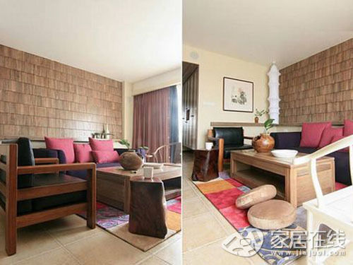 整個空間的主調(diào)都控制在原生態(tài)實木的寧靜氛圍中,粗獷的長凳、簡約的茶幾、大氣又實用的沙發(fā),這些看似不同風(fēng)格不同路線的家居物品在品海和皓月的“江南”雅集中都顯得那么的和諧與相稱。
