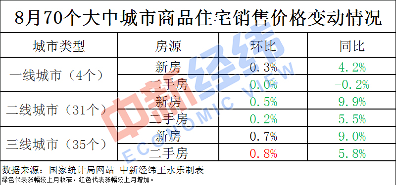 從國家統(tǒng)計局數(shù)據(jù)來看,8月份新房價格環(huán)比下跌城市數(shù)量為10個,創(chuàng)2018年4月以來新高;二手房連續(xù)出現(xiàn)了3個月20個城市房價下調(diào),為近2年來首次出現(xiàn);僅有三線城市二手房價格環(huán)比漲幅較上月略有擴大。