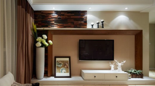 電視背景墻上方選用了少量文化石來做點綴,屋主很是歡喜。白色電視柜以及起裝飾作用的花瓶透露出一點現(xiàn)代的氣韻,但因為色澤和整體造型的原因,混在整個大環(huán)境里,讓客廳空間更為飽滿有趣。