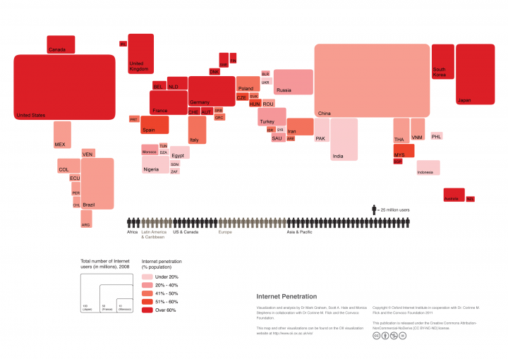 值得注意的是,圖1使用的是2011年的數(shù)據(jù),而圖2使用的是2006年的數(shù)據(jù)。由此看出,早在九年前亞洲的網(wǎng)民群體已經(jīng)非常龐大了。就此,馬克?格雷厄姆(Mark Graham)和德斯特凡諾?德?賽巴塔(Stefano De Sabbata)這兩位研究員得出了結(jié)論:“第一,亞洲的崛起使世界網(wǎng)民人數(shù)激增,目前全球42%的網(wǎng)民生活在亞洲。另外,中國(guó)、印度和日本的網(wǎng)民總數(shù)超過(guò)了歐洲和北美的網(wǎng)民人數(shù)的總和!