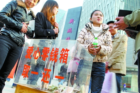 昨天下午5時(shí)許,記者在鄭州市農(nóng)業(yè)路與花園路交叉口西南角見到了小王及她的零錢箱,采訪期間,仍不斷有人向“愛心零錢箱”中投錢。