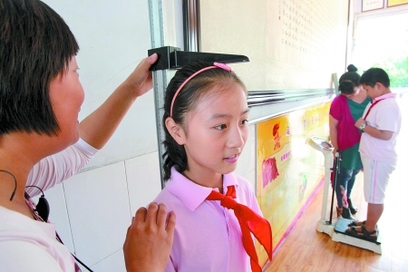 暑假放假之前,鄭州市二七區(qū)春暉小學(xué)給同學(xué)們布置了一個特殊的暑假作業(yè):放假第一天,測量一下自己的身高、體重、視力;等開學(xué)時,再測量一遍。昨天上午,春暉小學(xué)五(3)班的同學(xué)們排成三隊,有序測量身高、體重和視力。