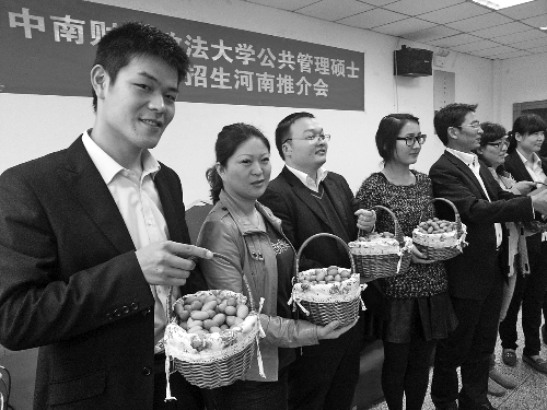杜興洋還代表學(xué)校,把一籃籃橄欖贈(zèng)送給新報(bào)名的考生,“橄欖又叫‘福果’,寓意祝福和眷戀。送橄欖,既表達(dá)了我們對(duì)河南考生的期盼之情,也代表中南財(cái)大對(duì)老家河南的眷念。”杜興洋在受訪時(shí)說(shuō)。目前,中南財(cái)大是國(guó)家“211工程”和“985工程”優(yōu)勢(shì)學(xué)科創(chuàng)新平臺(tái)項(xiàng)目重點(diǎn)建設(shè)高校,希望河南在職考生能踴躍報(bào)考MPA。