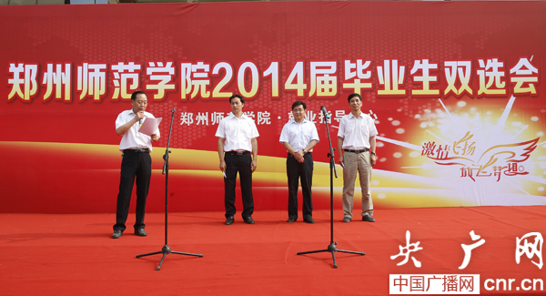 央廣網(wǎng)河南分網(wǎng)消息 (記者汪寧 通訊員朱宏偉)6月7日上午,鄭州師范學(xué)院2014年畢業(yè)生雙選會(huì)在東校區(qū)舉行。河南省教育廳大學(xué)生就業(yè)服務(wù)中心政策研究室主任文正建,院長(zhǎng)趙健、副院長(zhǎng)張建航等出席開幕式。