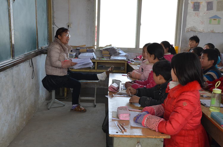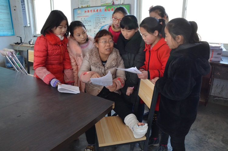 薛老師的左腿打了夾板,下垂時(shí)間長了會(huì)腫脹,所以她一上課,學(xué)生們就給她搬來一個(gè)凳子,把受傷的腿支起來。需要板書的時(shí)候,她就蜷起傷腿,靠一條腿撐地。