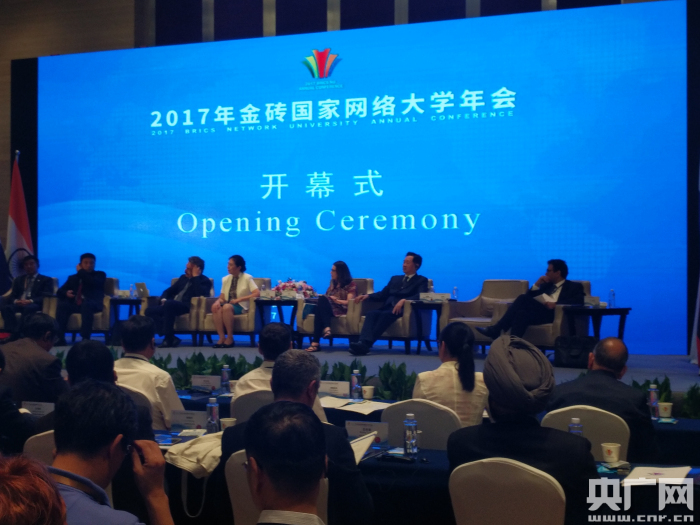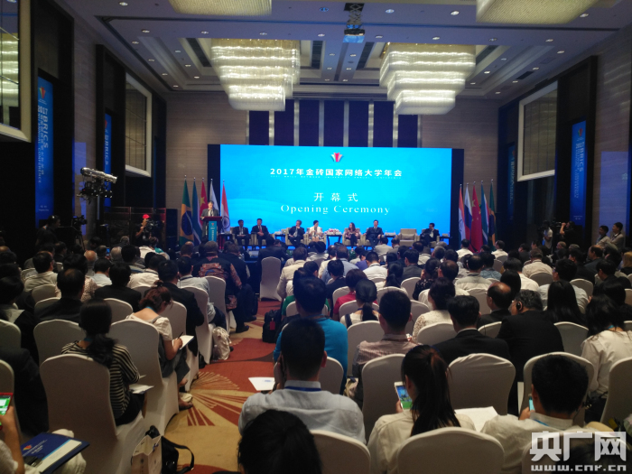 央廣網河南分網7月3日消息(雷燕超 文/圖)7月2日上午,由中華人民共和國教育部國際合作與交流司主辦,河南省教育廳、河南省參與建設“一帶一路”工作領導小組辦公室協(xié)辦,華北水利水電大學承辦的2017年金磚國家網絡大學年會開幕式在鄭州隆重召開。出席開幕式的有中國教育部國際交流與合作司副司長王慧,河南省委高校工委書記、河南省教育廳廳長朱清孟,華北水利水電大學黨委書記王清義,校長劉文鍇以及來自中國、俄羅斯、印度、巴西、南非“金磚五國”的教育部官員,金磚國家網絡大學22所成員高校以及其它高校的校領導和專家學者代表200余人,共商高等教育合作、交流、發(fā)展大計。