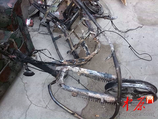 上午9時許,記者來到中原路京廣路時,自燃的電動車正放在路邊一間修車行里,被燒得精光,只剩一副鐵架子。