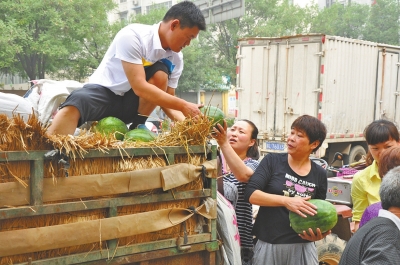 事故現(xiàn)場變成義買現(xiàn)場,車主也很受感動(dòng)。經(jīng)協(xié)商,他答應(yīng)只收取600元的維修費(fèi)。張勝利借錢回來后,得知妻子已經(jīng)賣掉1000多斤西瓜,并且車主僅收600元維修費(fèi),他又驚又喜,連連向眾人表示感謝。就在這時(shí),附近的九弟超市來人說,剩余的西瓜他們?nèi)?圍觀的人們紛紛鼓掌。(記者杜文育 實(shí)習(xí)生肖曉文圖 )