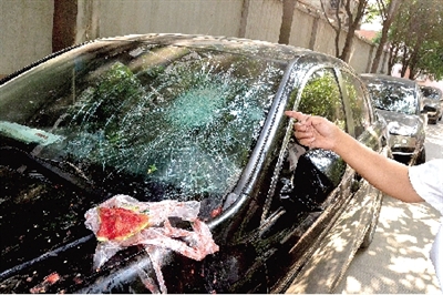 昨日9點(diǎn),記者趕到桐柏路與宏河路交叉口西側(cè)的金桐小區(qū),8號(hào)樓前,一輛黑色雅閣轎車(chē)前擋風(fēng)玻璃的左側(cè)被砸成了蜘蛛網(wǎng),一個(gè)垃圾袋內(nèi)還有大片西瓜皮,地面上也東一塊西一塊全是碎瓜皮。